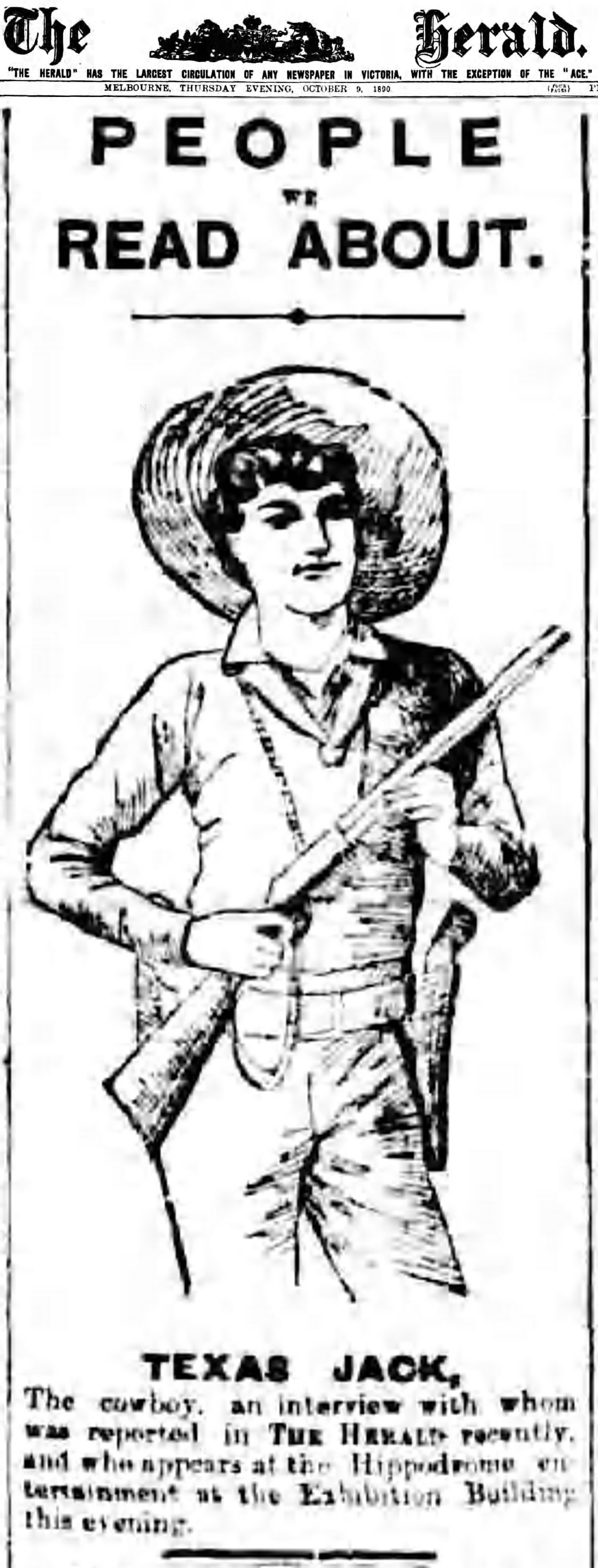 Mustering up all our journalistic bravado, we inquired, "Well, sir, what's your business; what is your name?" "I'm Texas Jack, the cowboy ranger of the Plains. I am in town with Messrs Hayden, Wilson, and Lyon's Wild West Company, showing at the Exhibition Buildings on Thursday, 9th October, amongst other things in cowboying, showing how I throw the lasso, cut cattle, ride buck-jumping horses, &c."