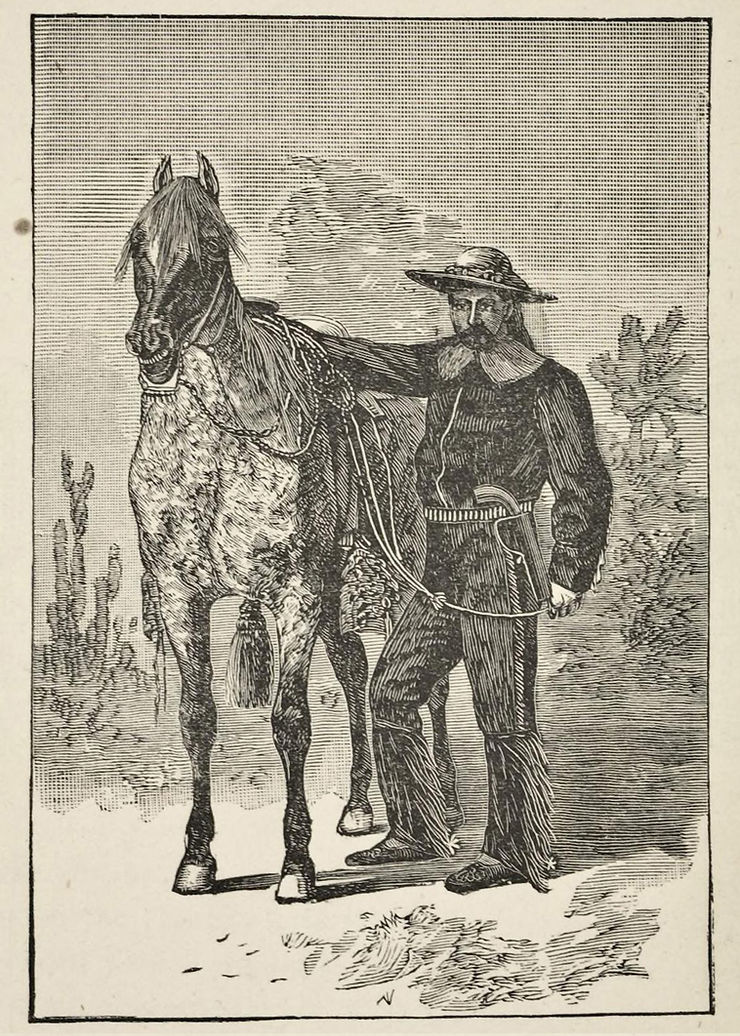 How he imbibed the love of adventure to such an extent as to cause him to determine, even when a boy in one of the South Atlantic States, to enter upon the exciting life of the Southwest in Texas, we cannot conceive, though his surroundings at the date of his childhood were well adapted to fit him, as far as horsemanship, hunting, and trapping were concerned, for the new life he was to lead. He often, in those days, assisted in furnishing the family table with game of his own shooting. We find him very early determined to become the owner of large herds of cattle. He had heard of the immense ranches of Texas and their wealthy owners, and intended to use what means he had collected from the results of his sure aim with the rifle, to take him to that country, where he expected to realize the visions of wealth that inspired him to youthful endeavor. He owned a pony with many good points, to which he was much attached, a rifle, revolver, and knife, in the use of which he had become distinguished among his fellows. With these and a few necessary articles of clothing and camping utensils suited to the journey, he left his pleasant home and friends.