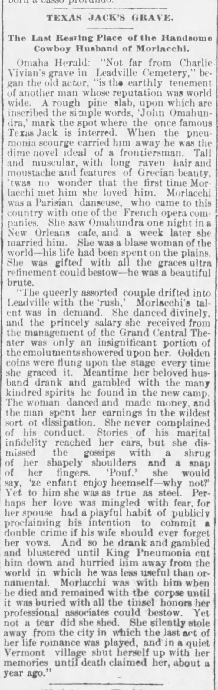 Omaha Herald: "Not far from Charlie Vivian's grave in Leadville Cemetery," began the old actor, "is the earthly tenement of another man whose reputation was world wide. A rough pine slab, upon which are inscribed the simple words, 'John Omahundra,' mark the spot where the once famous Texas Jack is interred. When the pneumonia scourge carried him away he was the dime novel ideal of a frontiersman. Tall and muscular, with long raven hair and mustache and features of Grecian beauty, 'twas no wonder that the first time Morlacchi met him she loved him. Morlacchi was a Parisian danseuse, who came to the country with one of the French opera companies. She saw Omahundra one night in a New Orleans cafe, and a week later she married him. She was a blase woman of the world—his life had been spent on the plains. She was gifted with all the graces ultra refinement could bestow—he was a beautiful brute.