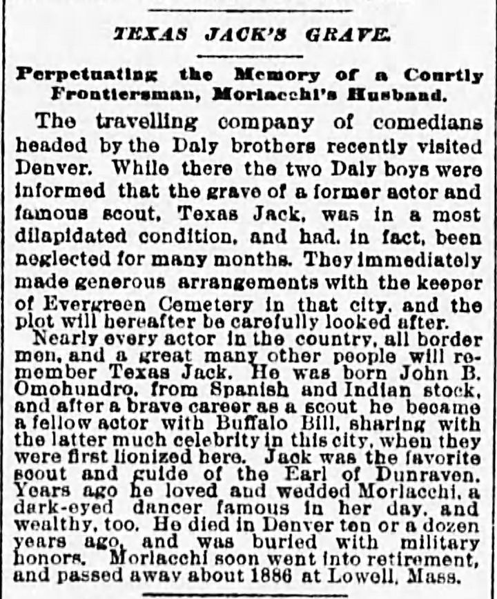 Texas Jack had been dead for nine years, and his wife Giuseppina Morlacchi for less than three, when this story about Jack's grave in Leadville was reprinted in newspapers across the country. Originating in the Omaha, Nebraska, Herald, it is shown here as reprinted in the Chattanooga, Tennessee, Daily Tribune of May 4, 1889: