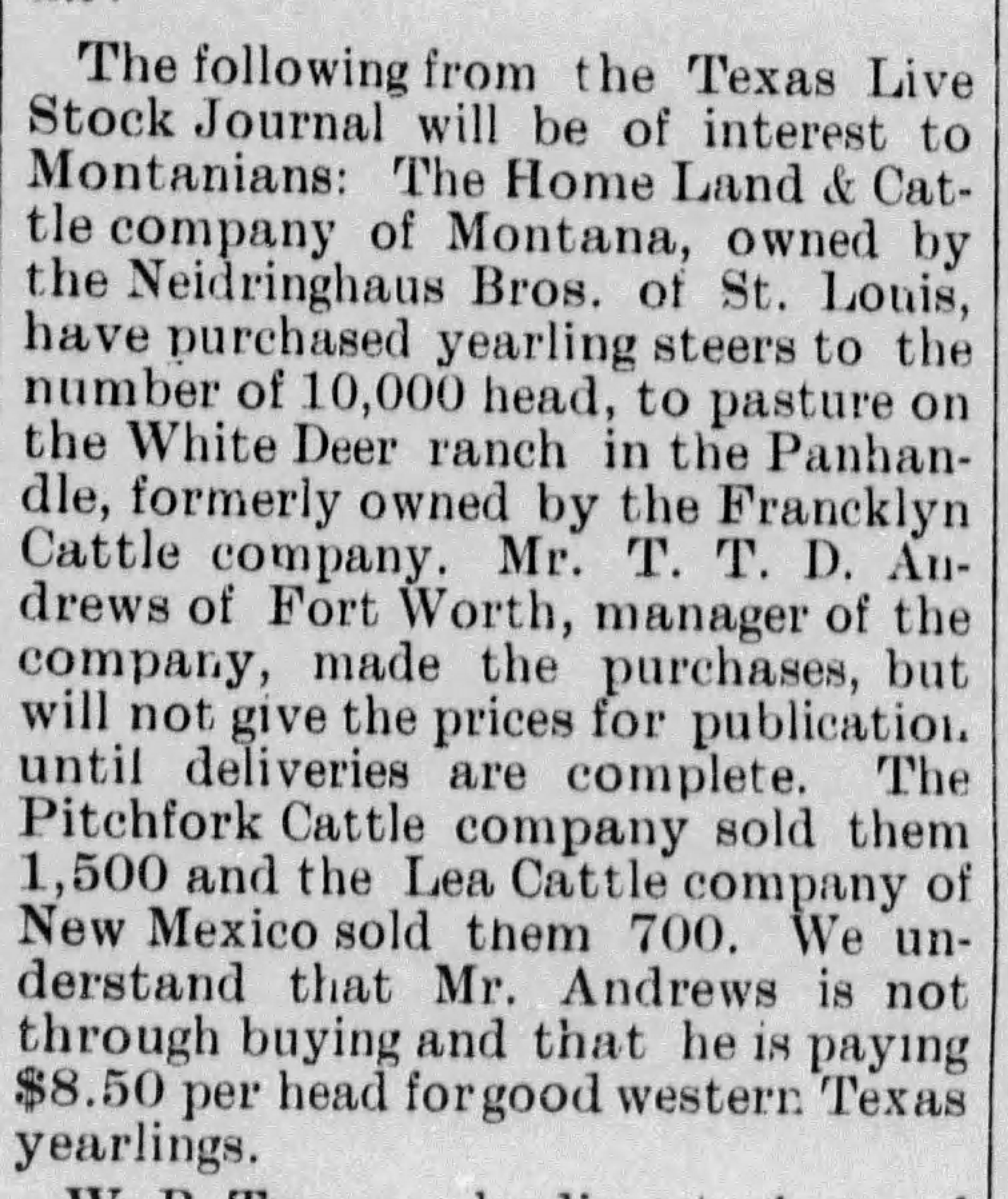 The earliest newspaper reference I can find is from the Montana Farming and Stock Journal of September 19, 1889, which lists that the Pitchfork Cattle Company sold 1,500 head of cattle to the Neideringhaus Brothers and their Home Land & Cattle Company. A subsequent appearance in the May 29, 1890 edition of the Billings Gazette of Billings, Montana, confirms both the name and brand were well established by this time.