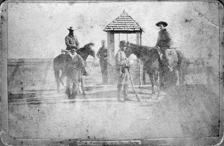 The handwritten caption on this second picture says "Lord Dunraven's Quarters," the building where Dunraven and his friend Dr. George Kingsley stayed while they were at Ft. McPherson. I believe that's Dunraven on the right and Kingsley on the left, with Texas Jack pictured second from left. The man standing second from the right is very clearly the man standing on the left in the first photograph. The man sitting in the middle looks to be the same man on horseback on the right side of the first picture.