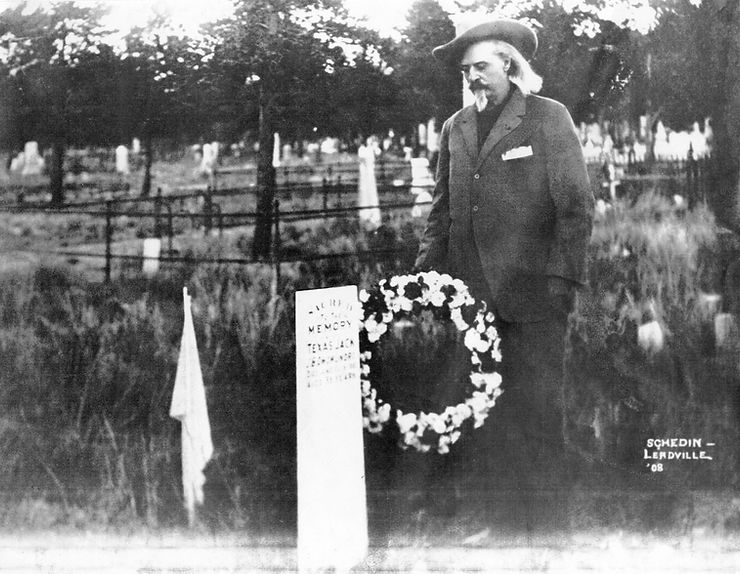 The granite stone that marks the grave of Texas Jack Omohundro in Leadville, Colorado's Evergreen Cemetery isn't the one that was placed on the day of his funeral. That one had his name, the date of his death, and a handwritten message in Italian from Jack's wife, prima ballerina Giuseppina Morlacchi. When that first grave marker was stolen, it was replaced with another, this one featuring a drawing of a horse, a rifle, a lasso, and a pair of crossed pistols, along with an incorrect age of 39, adding six years to Jack's age. The second memorial was also stolen, and all that was left when Jack's friend Buffalo Bill Cody visited Evergreen Cemetery 115 years ago, on September 5, 1908, was a white pine slab.
