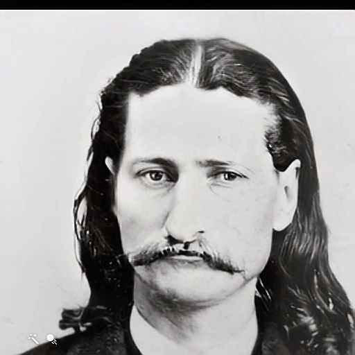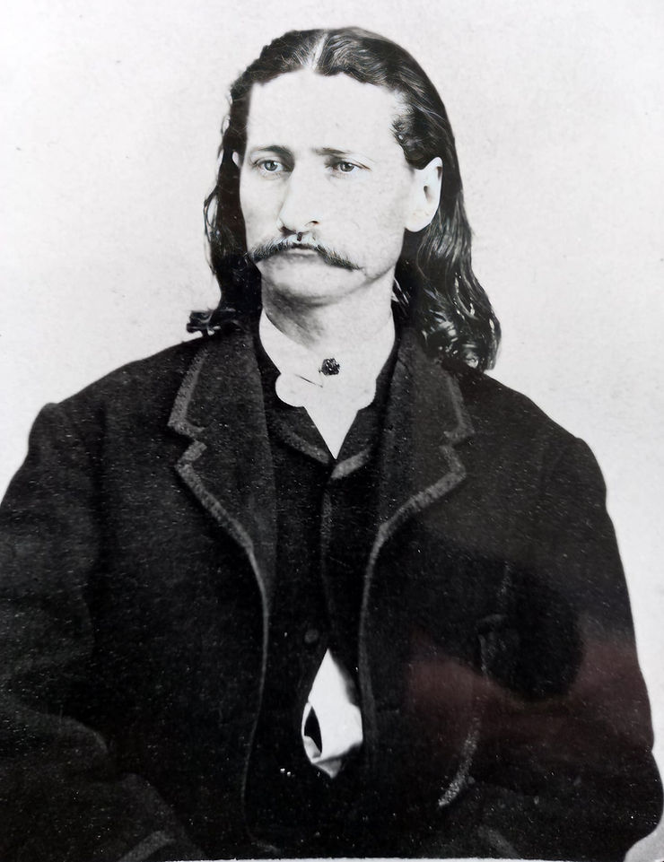 Mr. Wild Bill, or Mr. Hickok, is one of the finest specimens of humanity, physically, that I ever saw; he stands, I should think, six feet and an inch; but such a pair of shoulders, and such depth of chest and breadth of hips are not often seen. He has a broad forehead, small clear blue eyes, a very sharply cut, small mouth, and a square, firm chin, altogether a very pleasant face for a friend. But one may easily imagine how that forehead could contract, those eyes snap, the lips form a straight line, the chin draw up slightly, making a face which would indicate a decidedly ugly customer.