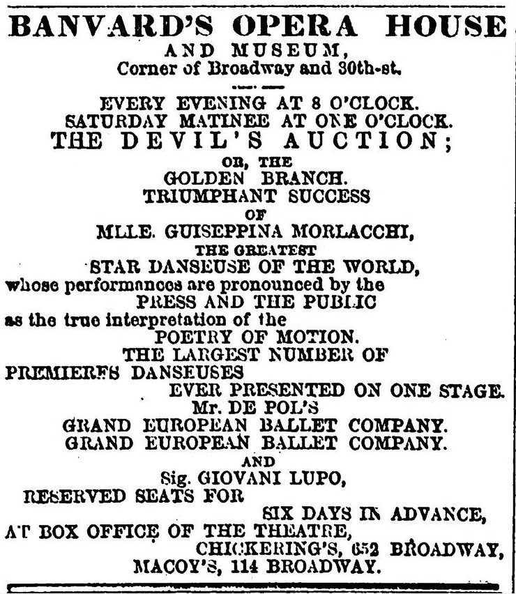 But as the first book musical, The Black Crook, dominated New York's Broadway, Morlacchi was paid her extravagant fee to star in the competing play, The Devil's Auction.