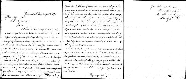 "He was the most pitiful looking specimen I ever saw. He was muddy all over, barefooted, bareheaded and badly wounded in the right arm, and so footsore that he could scarcely walk. He proved to be a packer from Terry's command, and had left the mouth of Powder River in company with one Henry Pique, a deserting soldier. When near the point where we picked him up they had seen Indians on the bluff, and attempted to cross. Seeing a small boat on the opposite side, one of them swam across and brought it over. They started to get their mule and camp outfit they had left behind. They had got only a few yards when they were fired into, and the deserter was killed and Pickens was struck in the arm, but gained the bluff. He was chased by Indians back into the brush, and there remained until we picked him up. No more Indians were seen until late in the afternoon, when a few appeared on the north side of the river. They were evidently pickets; and nothing further of importance occurred until we met the steamboat Carroll coming down from General Terry's headquarters."