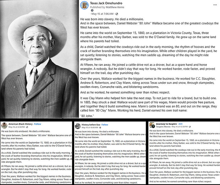 On the morning of May 15, I published a Facebook post about Daniel Webster "80 John" Wallace—born into slavery in 1860, died a millionaire, and became one of the great unsung cowboys of the American West. It was a new take on a blog article I’d originally written two years earlier, one I decided to rewrite in the cinematic tone I use for my podcast work. The post struck a chord.