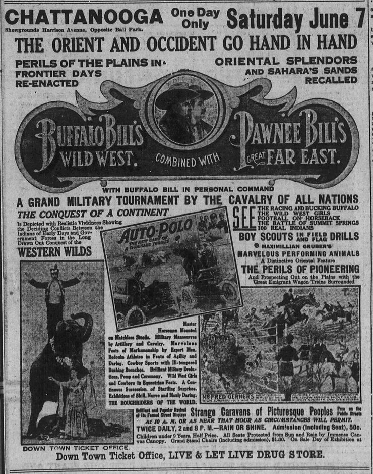 Cody visited Chattanooga with his shows eight times, though, during the last visit on June 7, 1913, with the “Two Bill’s Show” he ran with Pawnee Bill Lillie, he was ill at a cousin's house in Knoxville and could not attend, leading to poor ticket sales. The following month in Denver, the show was seized by a businessman named Harry Tammen after Cody reportedly fell behind repaying a loan. Though Cody was forced by the conditions of the loan to leave the Two Bill’s Show and tour with Tammen's Sells-Floto Circus, Buffalo Bill never owned or operated his own show again.