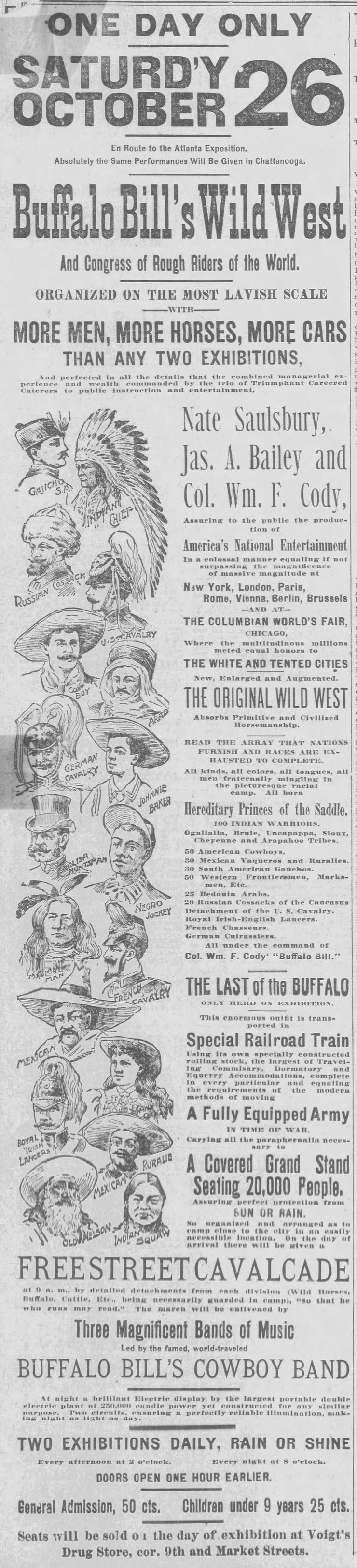 One hundred twenty-eight years ago this week, on October 26, 1895, Buffalo Bill's Wild West made its first stop in my hometown, Chattanooga, Tennessee. Along with William F. Cody came two trains totaling fifty or more cars. On these trains were as many as 500 cast and staff members, including twenty-five cowboys, a dozen cowgirls, and one hundred Indian men, women, and children. They were fed three hot meals a day, cooked on twenty-foot-long ranges. The show generated its own electricity with enormous generators designed by Thomas Edison’s company and staffed its own on-site fire department. Performers lived in wall tents during long stands or slept in railroad sleeping cars when the show moved daily. Business on the back lot was carried on in what one reporter called “a Babel of languages.” Expenses were as high as $4,000 per day.
